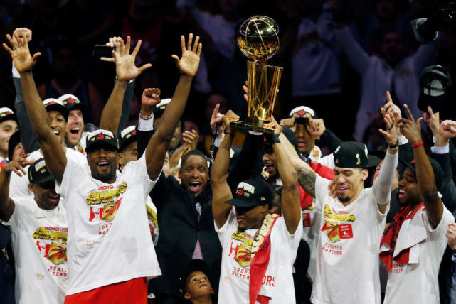2019年总决赛第6场,猛龙以114-110击败勇士,系列赛4-2淘汰勇士,赢得队史上第一个总冠军,莱昂纳德荣获总决赛MVP。汤普森在第三节扣篮左膝盖受伤,拄拐杖离开球馆。