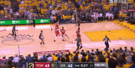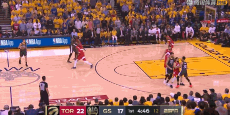 第二节进行到9分16秒,考辛斯内线强打伊巴卡,强行上篮得分,勇士38-37反超比分。猛龙并没有慌乱,利用出色的传导球,由西亚卡姆和范弗利特连续投中三分,重新以43-38领先。